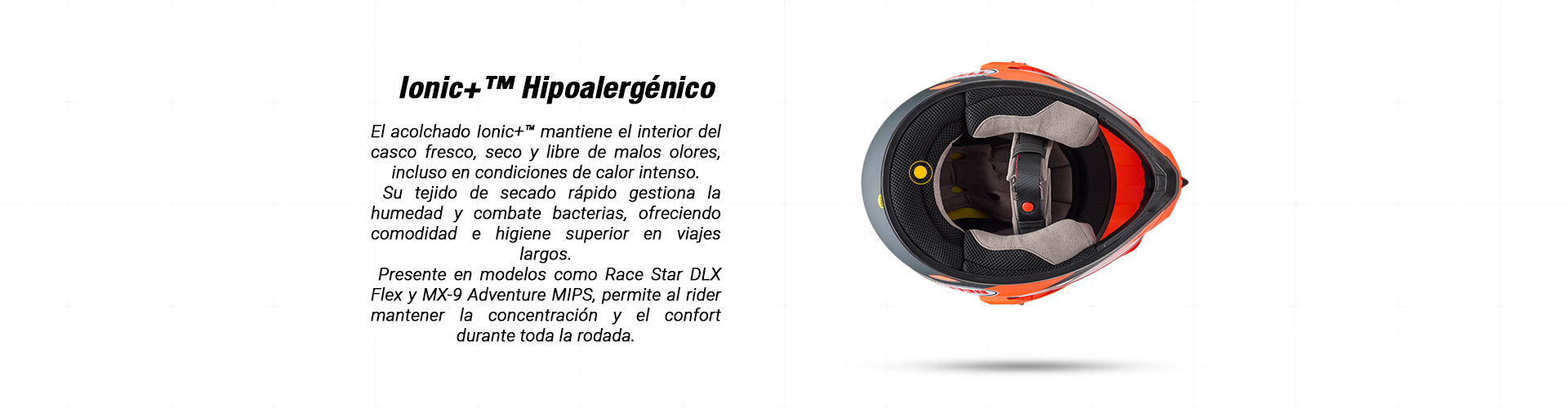 El interior con acolchado IONIC+™ controla la humedad, elimina bacterias y es completamente desmontable para facilitar su limpieza. Además, cuenta con bolsillos integrados para sistemas de comunicación Bluetooth, haciéndolo tan versátil como potente.