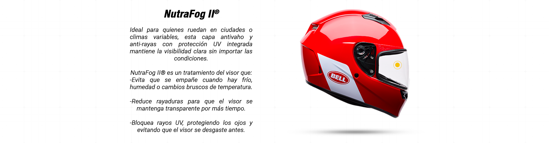 - Visor NutraFog II anti-vaho, anti-rayaduras y protegido contra los rayos UV.